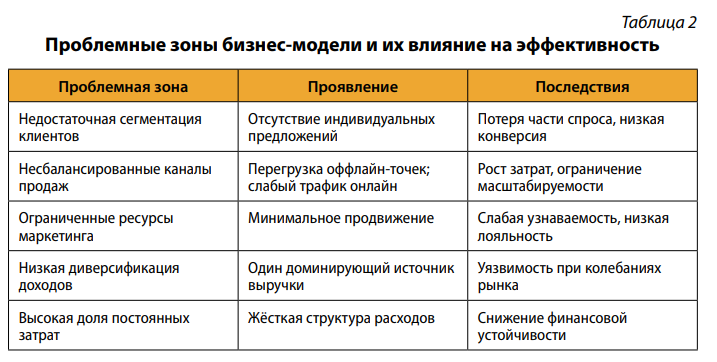 В исследуемой модели выявлен ряд проблем, связанных с недостаточной персонализацией продукта для отдельных клиентских сегментов, ограниченной диверсификацией каналов продаж и отсутствием оптимального распределения ресурсов. При этом имеются предпосылки для значительного повышения эффективности за счёт уточнения целевой аудитории, трансформации ценностного предложения и корректировки операционной деятельности.