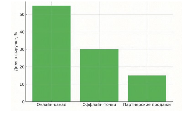 Существенным фактором является несбалансированная структура каналов продаж, что подтверждается результатами диаграммы: более половины выручки формируется онлайн-каналом, тогда как оффлайн-точки обеспечивают значительно меньший вклад при более высокой операционной нагрузке. Партнёрские каналы задействованы лишь частично, из‑за чего предприятие недополучает эффект от расширения рынка через внешние дистрибутивные сети.
