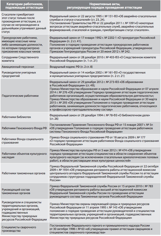 Законодательно закреплены лишь некоторые категории работников, подлежащие аттестации. К ним относятся: спасатели, прокурорские работники, имеющие классные чины либо занимающие должности, по которым предусмотрено присвоение классных чинов, сотрудники Следственного комитета, авиационный персонал, руководители унитарных предприятий, работники библиотек, педагогические работники, работники Пенсионного Фонда РФ, работники Фонда социального страхования, работники Фонда культурного наследия и т.д.