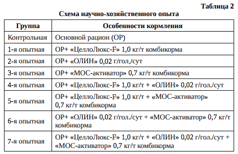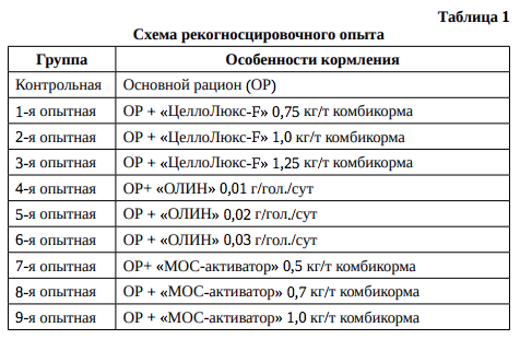 Птица 1-й опытной группы в составе основного рациона получала ферментную добавку «ЦеллоЛюкс-F» в количестве 0,75 кг/т комбикорма, 2-й опытной группы – ферментную добавку «ЦеллоЛюкс-F» в количестве 1,0 кг/т комбикорма, 3-й опытной группы – ферментную добавку «ЦеллоЛюкс-F» в количестве 1,25 кг/т комбикорма. Поголовью 4-й, 5-й и 6-й опытных групп в рацион добавляли, соответственно, по 0,01, 0,02 и 0,03 г/гол./сут пробиотика «ОЛИН». В 7-й, 8-й и 9-й опытных группах в скармливаемый комбикорм добавляли пребиотик «МОС-активатор» в количестве 0,5, 0,7 и 1,0 кг/т комбикорма соответственно.