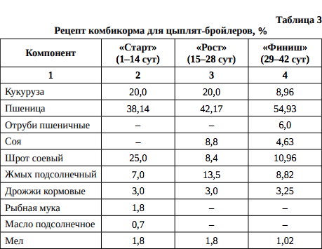 Результаты исследований и их обсуждение. При проведении рекогносцировочного опыта применялась трехфазная система выращивания цыплят-бройлеров, принятая в самом хозяйстве. Первая фаза выращивания включала первые две недели, вторая фаза – третью и четвертую недели и третья фаза – период до убоя. В соответствии с этими фазами выращивания было организовано и кормление подопытных цыплят-бройлеров. При этом использовался основной рацион, представленный стартовым, ростовым и финишным комбикормами (табл. 3).