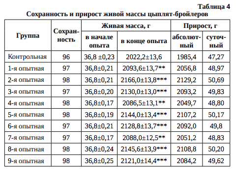 Анализ данных, приведенных в табл. 4, позволяет сделать заключение о лучших дозах отдельного использования изучаемых БАД при выращивании цыплят-бройлеров, поскольку сохранность и интенсивность роста являются важными продуктивными показателями откармливаемых животных и птицы. В частности по этим показателям лучшие результаты зафиксированы во 2-й, 5-й и 8-й опытных группах.