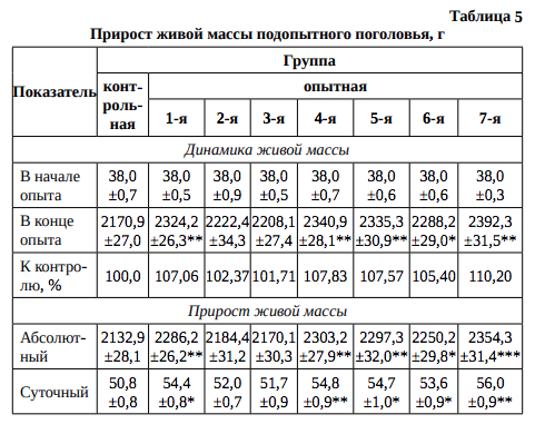 Общий расход комбикорма за период выращивания ввиду разной сохранности поголовья в подопытных группах составил 418,8–423,8 кг. В дополнение к затраченному за период опыта комбикорму в опытных группах израсходовали: ферментного препарата «ЦеллоЛюкс-F» – 1690,3 г, пробиотического препарата «ОЛИН» – 331,45 г, пребиотического препарата «МОС-активатор» – 1183,83 г. Это позволило повысить количество полученного прироста живой массы (в расчете на все поголовье) с 204,8 кг в контрольной группе до 210,5–230,7 кг – в опытных группах.