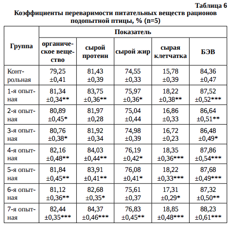 Переваримость питательных веществ рациона. Чем лучше перевариваются в организме птицы питательные вещества, тем выше эффективность используемого корма. Анализ полученных результатов показывает, что использование изучаемых препаратов («ЦеллоЛюкс-F», «ОЛИН» и «МОС-активатор») в отдельности и в различных сочетаниях при кормлении птицы опытных групп способствовало лучшему перевариванию всех питательных веществ скармливаемого им комбикорма, что подтверждается рассчитанными коэффициентами переваримости (табл. 6).