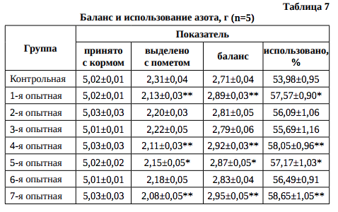 При изучении баланса и использования азота максимальная разность с контрольной группой была зафиксирована в 7-й опытной группе, в которой количество отложенного в организме птицы азота было на 0,23 г больше, а его использование повысилось с 53,98 до 58,65 % (P ≥ 0,99) по сравнению с контролем.