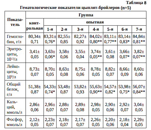 Так, концентрация гемоглобина с 80,34 г/л у цыплят контрольной группы увеличилась до 84,84 г/л у цыплят 7-й опытной группы, что больше на 4,5 г/л (P ≥ 0,99). Количество эритроцитов в крови птицы этой опытной группы также увеличилось до 3,82 г/л (P ≥ 0,99). Во 2-й, 3-й и 5-й опытных группах зарегистрировано недостоверное, по сравнению с контролем, повышение количества эритроцитов, а в остальных отмечалось стабильное нарастание содержания эритроцитов – 3,63–3,74×1012/л. Повышение содержания общего белка в сыворотке крови цыплят опытных групп (53,48–56,07 г/л) может служить подтверждением улучшения белкового обмена в их организме по сравнению с контролем (51,38 г/л). По концентрации кальция и фосфора установлены незначительные изменения между подопытными группами цыплятбройлеров.