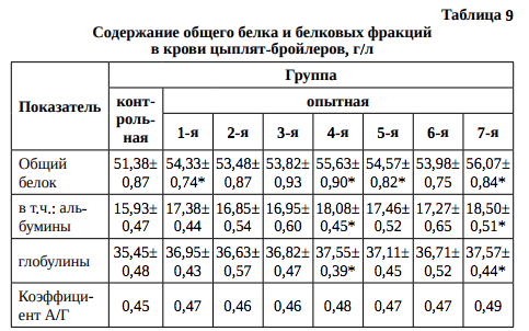 Также, по сравнению с контролем, повышалась и доля глобулинов в крови у цыплят опытных групп, причем достоверным это повышение отмечалось также в 4-й опытной группе на 2,10 г/л и 7-й опытной группе – на 2,12 г/л (P ≥ 0,95).
