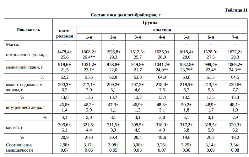 Мышечная ткань является наиболее ценной частью мяса. Применение тестируемых биологически активных препаратов в различных сочетаниях позволило улучшить состав мяса бройлеров (табл. 11).