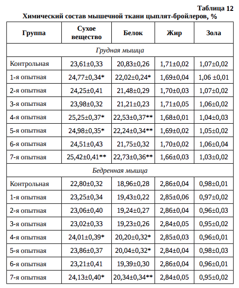 Данные химического анализа грудной и бедренной мышц послужили дополнительным подтверждением прямой зависимости между уровнем прироста живой массы, убойного выхода и морфологическими характеристиками тушек цыплят-бройлеров.