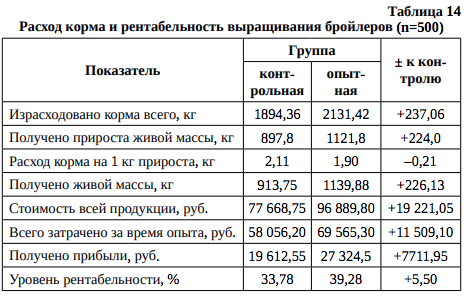 Данные табл. 13 подтверждают положительное влияние дополнительного введения в организм бройлеров биологически активных компонентов на состояние здоровья, выражающееся в повышении сохранности на 1–2 абс.% по сравнению с контролем.