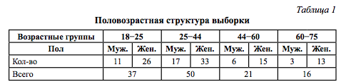 В выборке было 87 женщин и 37 мужчин. Возраст обратившихся − от 18 лет до 68 лет. В возрастном отношении выборка была неравновесной, этот параметр не являлся фильтром в отборе.