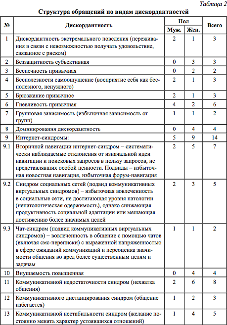Некоторые из исследуемых нами феноменов встречались у одного человека совместно, т.е. являлись кодискордантностями. Однако мы указывали только одну из них, представлявшую наибольшую актуальность для обратившегося.