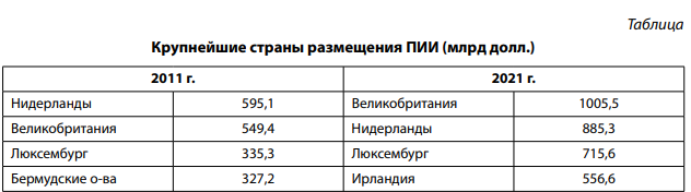 Стабильно высокие ПИИ, соответственно 51,2 % в 2011 г. и 54 % — в 2021-м, направляются в холдинговые компании. Увеличение доли холдинговых компаний во многом связано с усилением тенденции к непрямому владению, когда отношения собственности в филиалах устанавливаются с использованием сложных схем международных связей [3].