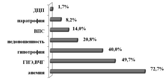 Несмотря на то, что большинство (79,2 %) умерших от инфекционных заболеваний детей родились доношенными, был выявлен неблагоприятный преморбидный фон: анемия у 72,7 % детей, перинатальная патология ЦНС – 49,7 %, внутричерепная гипертензия – 42,8 %, гипотрофия – 40,0 %, недоношенность – 20,8 %, врожденный порок сердца (ВПС) – 13,7 % паратрофия – 8,2 % и детский церебральный паралич (ДЦП) у 1,9 % больных (рис. 2).