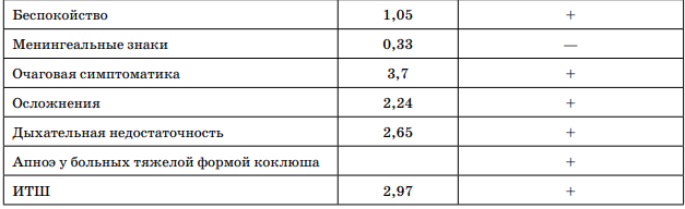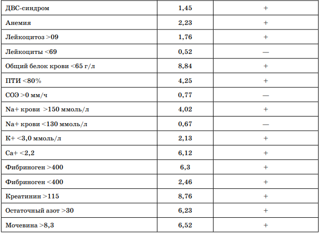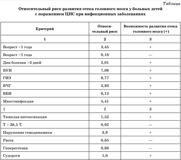 На основании клинических признаков болезни и лабораторных показателей рассчитан относительный риск развития отека головного мозга у больных детей с поражением ЦНС при инфекционных заболеваниях (табл.). Данные прогностической таблицы свидетельствуют, что основными факторами риска развития отека головного мозга у детей с инфекционными заболеваниями являются: возраст детей до 1 года; позднее поступление на 3 день болезни и позже; внутрибольничная и сопутствующая инфекции; ГИЭ/ ВЧГ, анемия, нарушение гемодинамики, судороги, беспокойство, очаговая симптоматика; осложнения болезни (тяжелая дыхательная недостаточность на фоне пневмонии, верхней и нижней обструкции дыхательных путей, ДВС-синдром и ИТШ); апноэ у больных тяжелой формой коклюша; высокий лейкоцитоз в ОАК, гипопротеинемия и снижение протромбинового индекса.