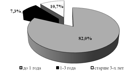 Возрастной состав умерших больных был представлен преимущественно детьми первого года жизни – 192 (82,0 %) больных, от 1 до 3-х лет – 17 (7,3 %) и старше 3-х лет – 25 (10,7 %) детей (рис. 1).