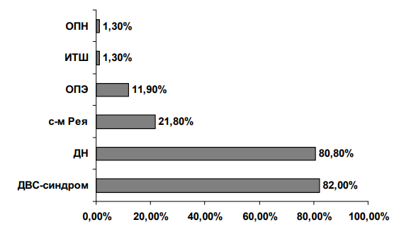 Согласно патологоанатомическому заключению, дыхательная недостаточность уменьшилась до (80,8 %) и появились такие диагнозы, как синдром Рея (21,8 %), острая печеночная недостаточность (11,9 %), инфекционно-токсический шок (ИТШ) (1,3 %) и почечная недостаточность (ГУС, ОПН) у (1,3 %) умерших больных (рис. 3).
