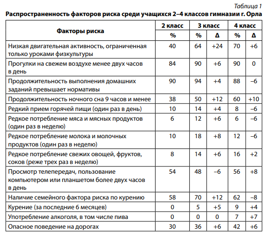 Результаты проведенного исследования выявили высокую распространенность факторов риска нарушения здоровья у обследованных учеников (табл. 1).