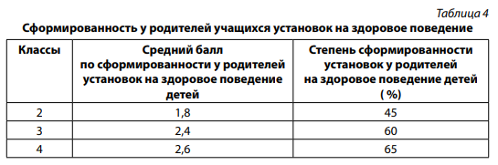 Анализ анкет школьников показал недостаточный уровень сформированности у учащихся установок на здоровый образ жизни. В динамике обучения степень сформированности снижается на 8 %. От 55 до 67 % учащихся никогда не делают утреннюю гимнастику. 65 % учащихся 4 классов считают, что будут курить в дальнейшем. 25 % детей 4 класса согласились бы покурить сигарету по предложению лучшего друга. До 75 % детей не моют руки после посещения туалета в школе.