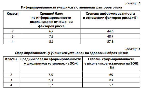 Анализ полученных результатов свидетельствует о низком уровне информированности учащихся в отношении ведущих факторов риска нарушения здоровья. Степень информированности к 4 классу составляет 57,3 %. К 4 классу от 35 до 46 % детей считают, что нерегулярное употребление пищи, низкая двигательная активность, недосыпание не наносят вреда здоровью. 54 % школьников считают, что, начав курить, потом нетрудно бросить эту привычку.