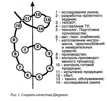 Дж. Джуран первым обосновал переход от контроля качества к управлению качеством. Им разработана знаменитая «спираль качества» (спираль Джурана) — вневременная пространственная модель, определившая основные стадии непрерывно развивающихся работ по управлению качеством (рис. 1) и послужившая прообразом многих появившихся позже моделей.
