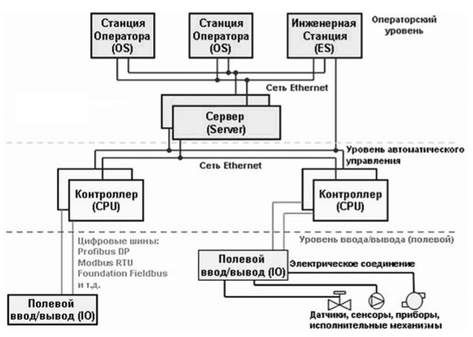 Чаще всего распределенные АСУ ТП имеют трехуровневую иерархическую структуру. Пример структурной схемы распределенной АСУ ТП приведен на рис. 1.