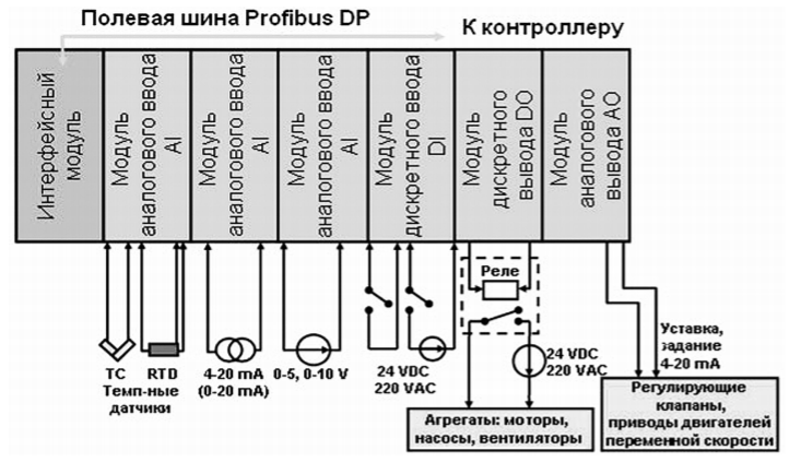 Более рациональным в такой ситуации является использование станций распределенной периферии, располагающихся в непосредственной близости к датчикам и исполнительным механизмам. Такие станции содержат необходимые модули ввода и вывода, а также интерфейсные модули для подключения к ПЛК через цифровую полевую шину, например, с использованием протоколов Profibus DP, или Modbus RTU. При этом цифровая передача сигналов осуществляется по одному кабелю с высоким уровнем помехозащищенности. К полевой шине можно подключать цифровые датчики и исполнительные устройства, имеющие в своем составе контроллеры и другие блоки, обеспечивающие преобразование сигнала в цифровую форму и реализующие обмен данными через полевую шину.