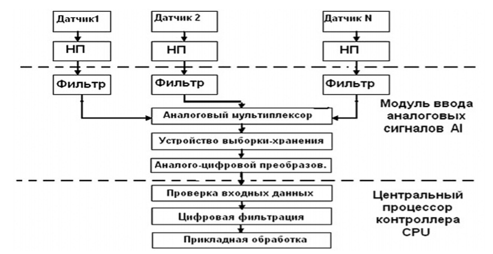 Сигналы от датчиков доводятся до нормированного уровня (4–20 мA, 0–10 В) нормирующими преобразователями (НП) и проходят этап аналоговой фильтрации. Аналоговые фильтры позволяют устранить высокочастотные шумы, которые могут быть вызваны, например, электромагнитными помехами при передаче сигнала по кабелю.