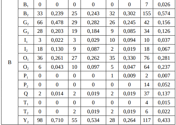 В сложной генетической системе В, представленной 31 антигеном, более высокой была частота групповых факторов крови B2, G2, O1, Y2, G’, O’ и Q’, которая у черно-пестрых быков составила 0,210–0,710, у красно-пестрых – 0,204–0,534, у симментальских – 0,245–0,547, у быков красных пород – 0,156–0,574. При этом наибольшие различия между породами были по эритроцитарному антигену Y2 и составили 0,446 между черно-пестрыми и симментальскими быками. Наименьшие различия были по антигену О1 (0,001) между черно-пестрыми и красно-пестрыми, а также по O’ (0,006) – между этими же породами и 0,011 – между симментальскими и красными, по фактору крови Q’ (0,017) – между красно-пестрыми и быками красных пород.