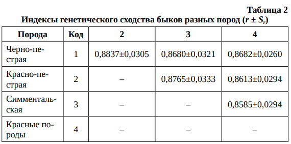По встречаемости эритроцитарных антигенов можно дать предварительное суждение о сходстве и различии между разными породами, типами, линиями, стадами и селекционными другими группами животных. Более точное представление об этом дают генетические дистанции и индексы генетического сходства между группами. Так, в табл. 2 приведены эти индексы между четырьмя породами крупного рогатого скота, которые варьировали от 0,8585 до 0,8837. Максимальная разность по индексу генетического сходства составила 0,0252, при этом наблюдалась тенденция к большему сходству между черно-пестрой и красно-пестрой породами, а к меньшему – между симментальской и красными породами.