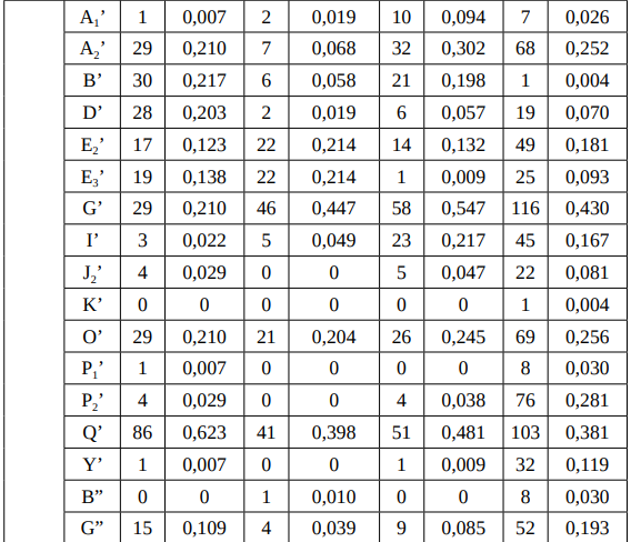 Наоборот, частота эритроцитарных антигенов B1, I1, I2, P1, P2, Q, T1, T2, I’, J2’, K’, P1’, Y’ и B” была значительно ниже по сравнению с вышеназванными факторами крови. У черно-пестрых быков она составила 0–0,130, красно-пестрых – 0–0,087, симментальских – 0–0,094 и у красных – 0,004–0,137.