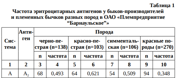 В табл. 1 приведена частота эритроцитарных антигенов у 138 быков черно-пестрой, 103 – красно-пестрой, 106 – симментальской и 270 гол. красных пород.