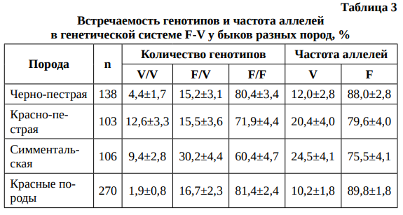 Анализ частот аллелей показал, что красные породы по частоте аллеля V превосходили, а по F уступали красно-пестрой и симментальской породам на 8,4–14,3 % (P < 0,05–0,01). Кроме того, достоверная разность в 12,5 % выявлена также между симментальской и черно-пестрой породами (P < 0,05).