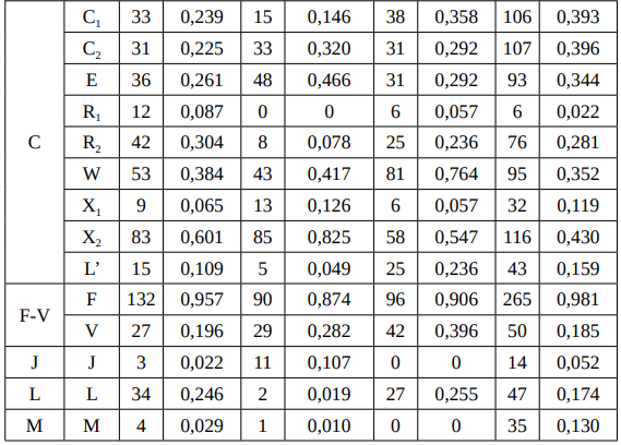 В генетической системе С встречаемость антигенов C1, C2, E, W и X2 у черно-пестрого скота составила 0,225–0,601, красно-пестрого – 0,146–0,825, симментальского – 0,292–0,764 и у красного – 0,344–0,430. Однако фактор крови R1 отсутствовал у всех производителей относительно молодой красно-пестрой породы. Его частота у быков черно-пестрой породы составила 0,087, симментальской – 0,057 и у быков красных пород – 0,022.