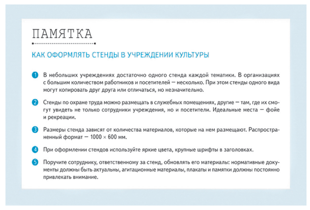 Что размещать. На стенде можно располагать не только нормативные документы, но и наглядные материалы, например схемы и инструкции по оказанию первой помощи пострадавшим.
