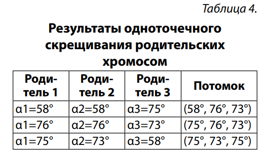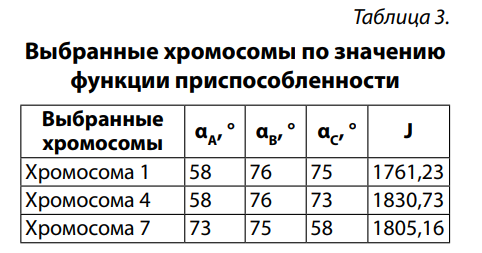 Как показано в таблице, хромосома с параметрами αA=58°, αB=71° и αC=73° демонстрирует наименьшее значение функции приспособленности J = 1725,6, что свидетельствует о её эффективности. Эта хромосома может быть признана наилучшим решением текущей итерации и использоваться в качестве базовой при формировании следующего поколения или при завершении алгоритма.