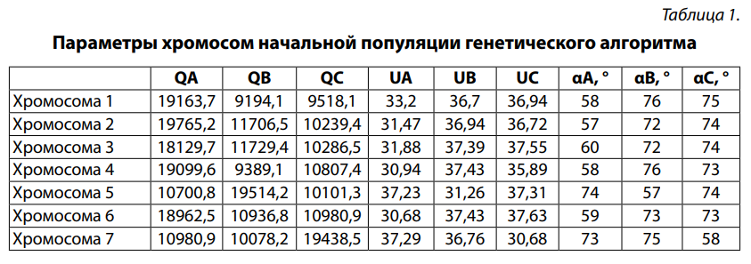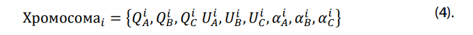 На данном этапе формируется начальная популяция, содержащая N хромосом, каждая из которых представляет собой потенциальное решение задачи – набор управляющих параметров системы компенсации реактивной мощности по фазам. В данной задаче – это угол открытия тиристоров αA, αB, αC, а также соответствующие значения реактивной мощности и фазного напряжения в каждой фазе.
