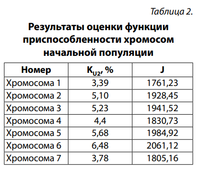 Каждая хромосома в популяции представляет собой конкретный набор управляющих параметров и для каждого такого набора рассчитываются физико-технические характеристики, влияющие на качество электроэнергии. Центральным показателем при этом является коэффициент несимметрия напряжения KU2, на основе которого формируется значение функции приспособленности J. Именно это значение и определяет, насколько «оптимальная» та или иная хромосома.