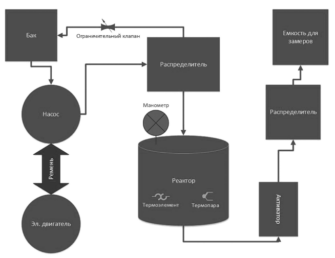 Установка гидротермальной деструкции представляет собой стенд, состоящий из электродвигателя трехфазного переменного тока мощностью 3 кВт с постоянными оборотами 2850 об/мин, масляного шестеренчатого насоса НШ10, двух гидравлических распределителей Р80-3/1-22, герметичного реактора объемом 6 л, состоящего из металлического корпуса с толщиной стенки 10 мм, нагревательного масляного тэна, термопары, манометра высокого давления, бака для растительного масла, активатора жидкости и гидравлических шлангов. Принципиальная схема показана на рисунке 1.