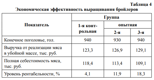 По окончании эксперимента была рассчитана экономическая эффективность в пересчете на 1000 гол. суточных цыплят (табл. 4).