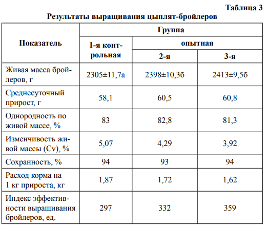 Результаты выращивания цыплят-бройлеров с использованием цельного зерна в комбикормах представлены в табл. 3.