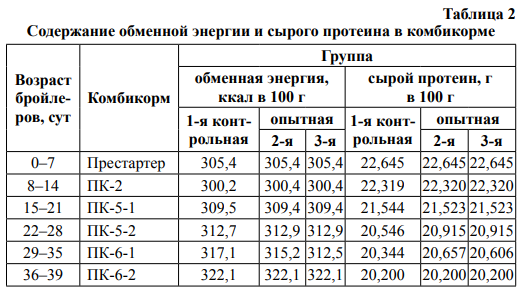 Содержание обменной энергии и сырого протеина в комбикорме представлено в табл. 2.