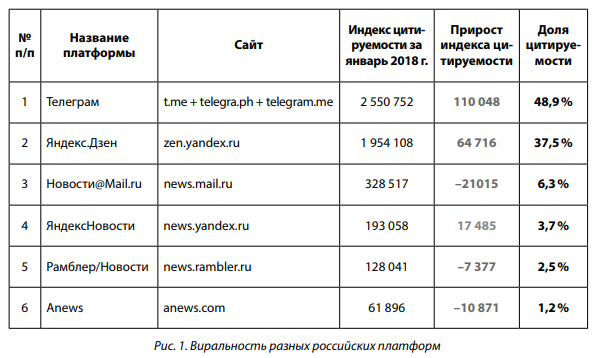 В январе Telegram, которому Роскомнадзор объявил настоящую войну в начале года, набрал 110 тыс. дополнительных цитирований. На втором месте оказался «Яндекс.Дзен» с приростом в 64 тыс. Виральность площадки «Новости@ Mail.ru» снизилась на 21 тыс. цитирований.