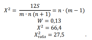 Для того чтобы определить значимость коэффициента конкордации, найдем критерий согласованности Пирсона.