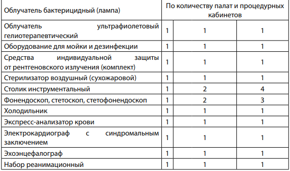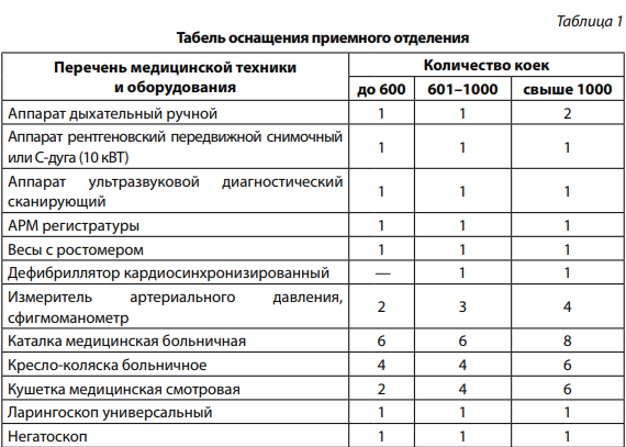Отделение оснащается медицинским оборудованием в соответствии со стандартом оснащения приемно-диагностического отделения (табл. 1).