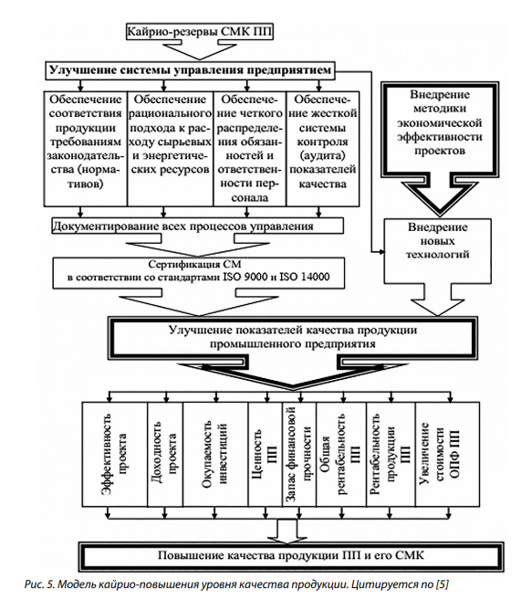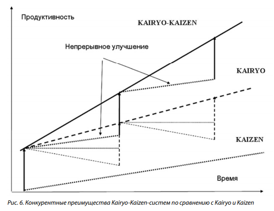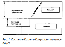 В своей работе [4] А.К. Севастьянов указывает, что Kairyo-система — это система улучшений, которую японцы используют как более близкую к западной культуре систему улучшений Kairyo или Kaikaku. Этот подход улучшений связан с инновациями (новыми идеями, техническими и организационными преобразованиями). Kairyo-система не требует больших усилий собственных работников, но предусматривает значительные инвестиции. Она основана на применении «больших» приращений. Kairyo — концепция крупных улучшений, предполагающая кардинальную реорганизацию процесса с использованием значительных инвестиций. Крупные улучшения качества связаны с использованием инновационных технологий, выпуском принципиально новой продукции, обладающей конкурентными преимуществами на рынке товаров. В современном мире долго и успешно функционируют на рынке лишь организации, которые развиваются постоянно.