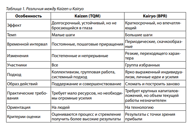 Согласно [1], между кайрио и кайдзен (последний метод был подробно рассмотрен автором в [3]) имеются следующие различия (табл. 1).