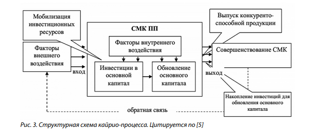 Как указывается в [5], кайрио-резервы повышения качества продукции промышленного предприятия могут быть описаны совокупностью таких характеристик, как инвестиционный климат, инвестиционная привлекательность, инвестиционная активность, инвестиционный потенциал и инвестиционный риск. При этом формирование кайрио-резервов, в ходе которого они последовательно проходят все фазы воспроизводства от момента концентрации инвестиционных ресурсов до получения экономического эффекта и возмещения вложенных средств, составляет кайрио-цикл. Эта взаимосвязь проявляется в структурной модели кайрио-процесса СМК ПП (рис. 3).