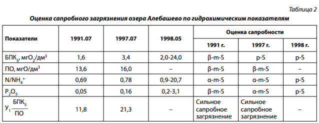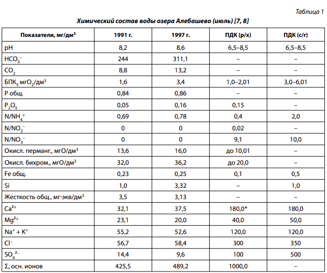 Исследования 1991 и 1997 гг. показали, что озеро Алебашево относилось к пресноводным водоемам со среднеминерализованной умеренно жесткой водой, слабощелочной величиной рН, гидрокарбонатного класса, кальциево-натриевой группы (табл. 1).
