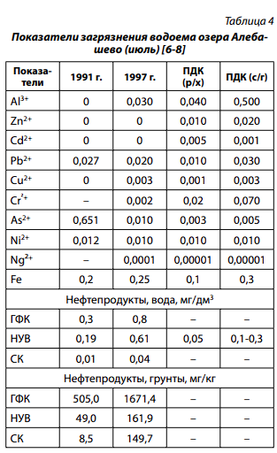 По содержанию ОВ и биогенов озеро в 1991 г. относилось к олиготрофным и меотрофным, в 1997 г. к β-m-сапробным, эвтрофным, в 1998 г. – к полисапробным и гипертрофным (табл. 3). Высокое содержание биогенов сопровождается интенсивным цветением озера в летнее время и искажением динамики зоопланктона. Кроме биогенного и органического загрязнения в воде и донных отложениях (ДО) обнаруживались тяжелые металлы (ТМ) и нефтепродукты (табл. 4).